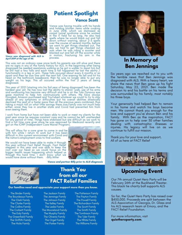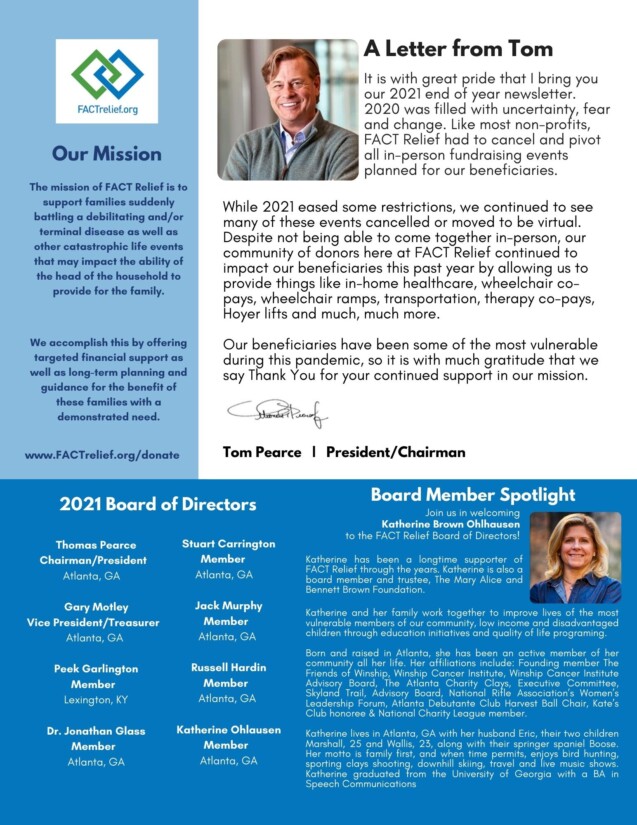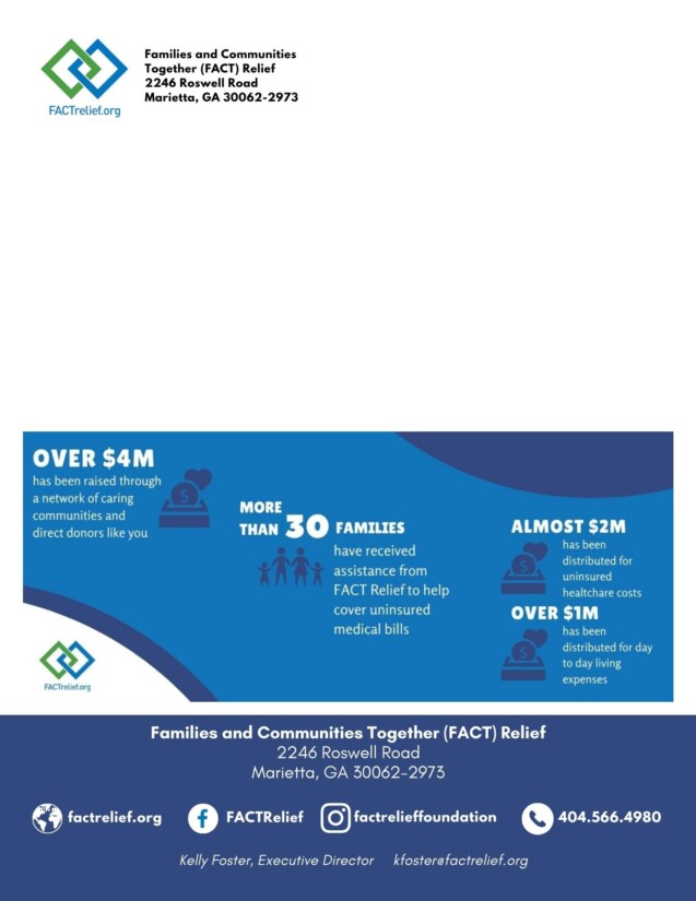 Thank you. Your gift allows us to ease the lives of our beneficiaries as well as the lives of their loved ones. FACT Relief is a 501(c)(3) non-profit organization that allows for contributions to be donated in a tax-free manner. Funds can be specified to the beneficiary campaign of choice and all bills and uninsured medical expenses are paid directly from FACTrelief.org. This also ensures that money raised for each beneficiary does not count towards assets or income. Donate Today!